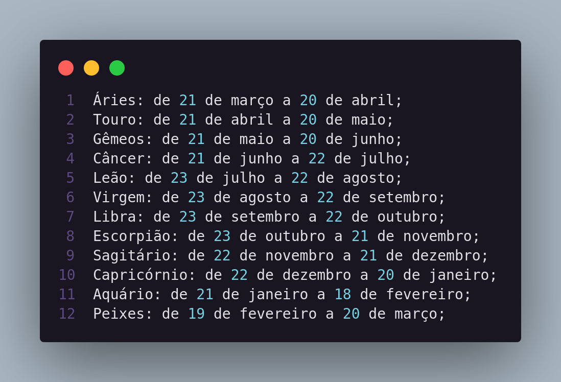 Receber valores numéricos para o dia e o mês de nascimento de uma pessoa; Exibir o signo da pessoa de acordo com os seguintes critérios:
